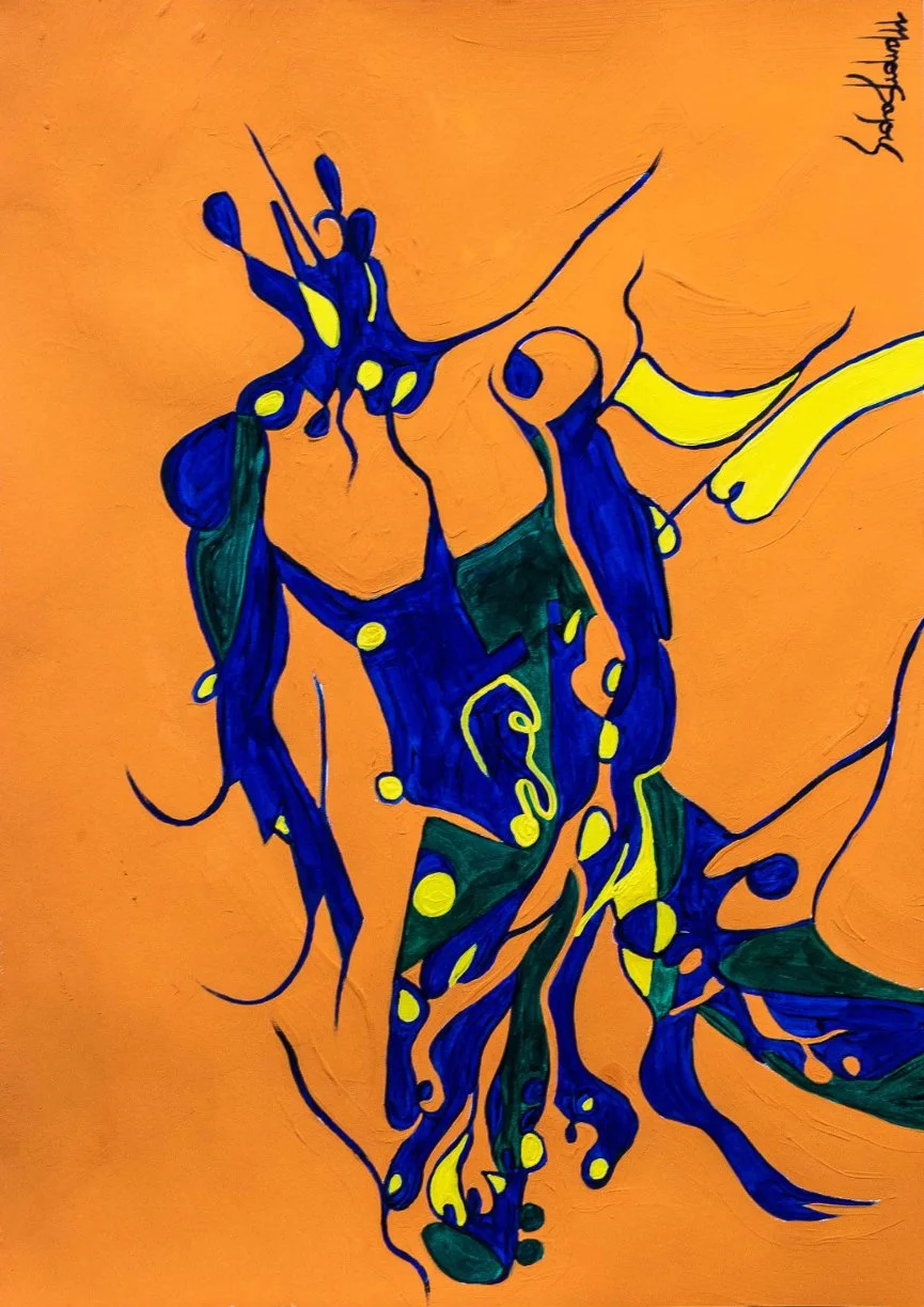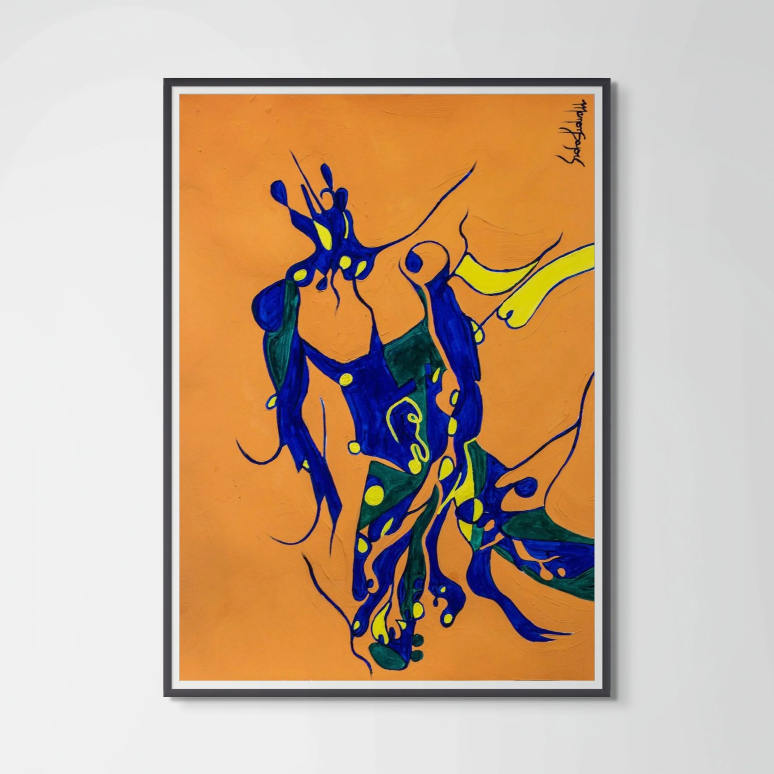 Sous l'orange brûlant, un homme se tient, plongé dans son passé, enveloppé comme par une mer protectrice. Sûr de sa beauté et de sa force, il cache sa vulnérabilité sous une bruyante certitude.