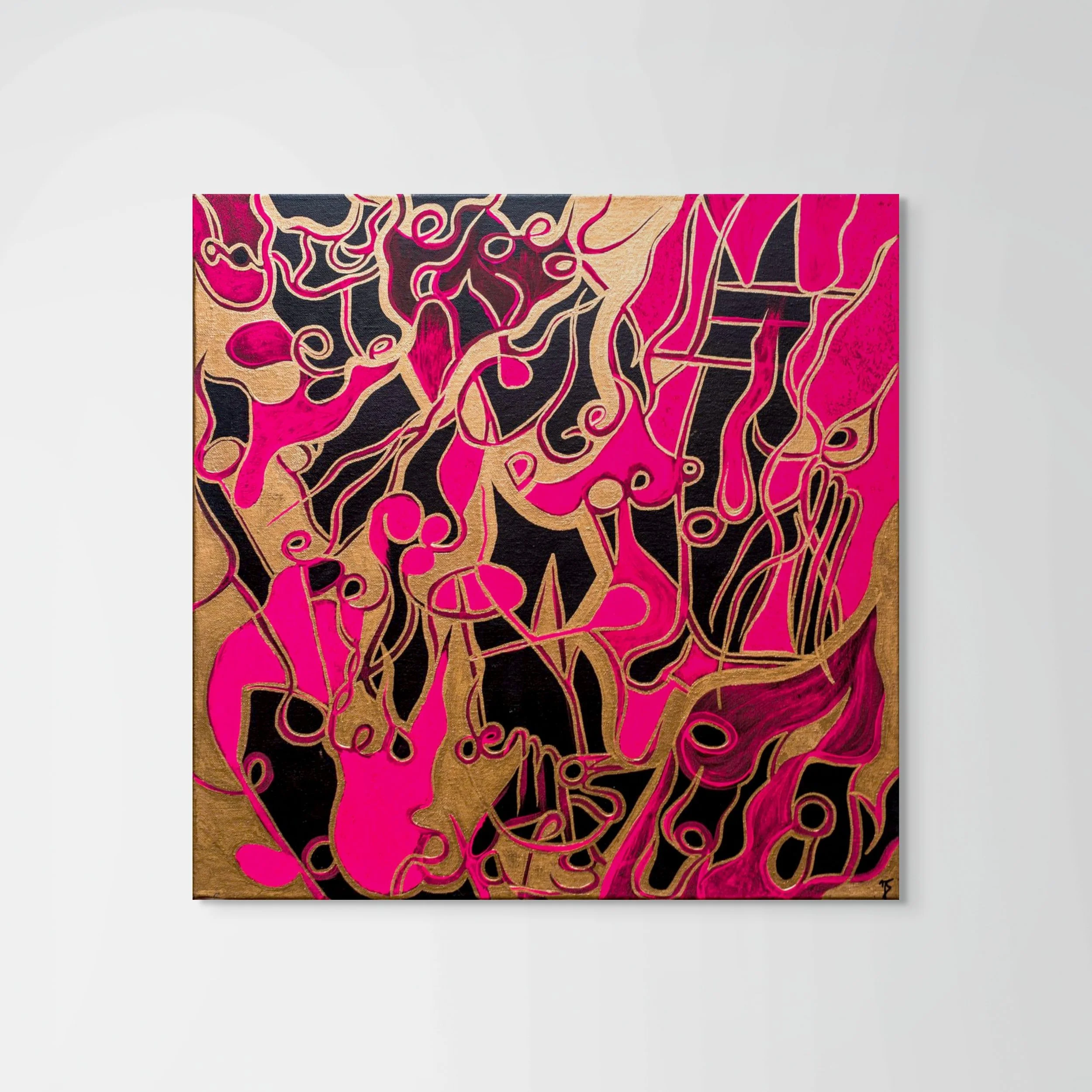 Plongée dans le chaos brut de la vie nocturne. Le néon rose palpite avec l’intensité des connexions éphémères, tandis que des éclats dorés transpercent les salles enfumées comme des projecteurs. Un noir profond engloutit les contours, chargé de secrets, tandis qu’une tension palpable engendre le désordre. Un cirque de sueur, de sons et d’émotions sature l’air, laissant une empreinte viscérale de la nuit qui persiste bien après que la musique se soit tue.