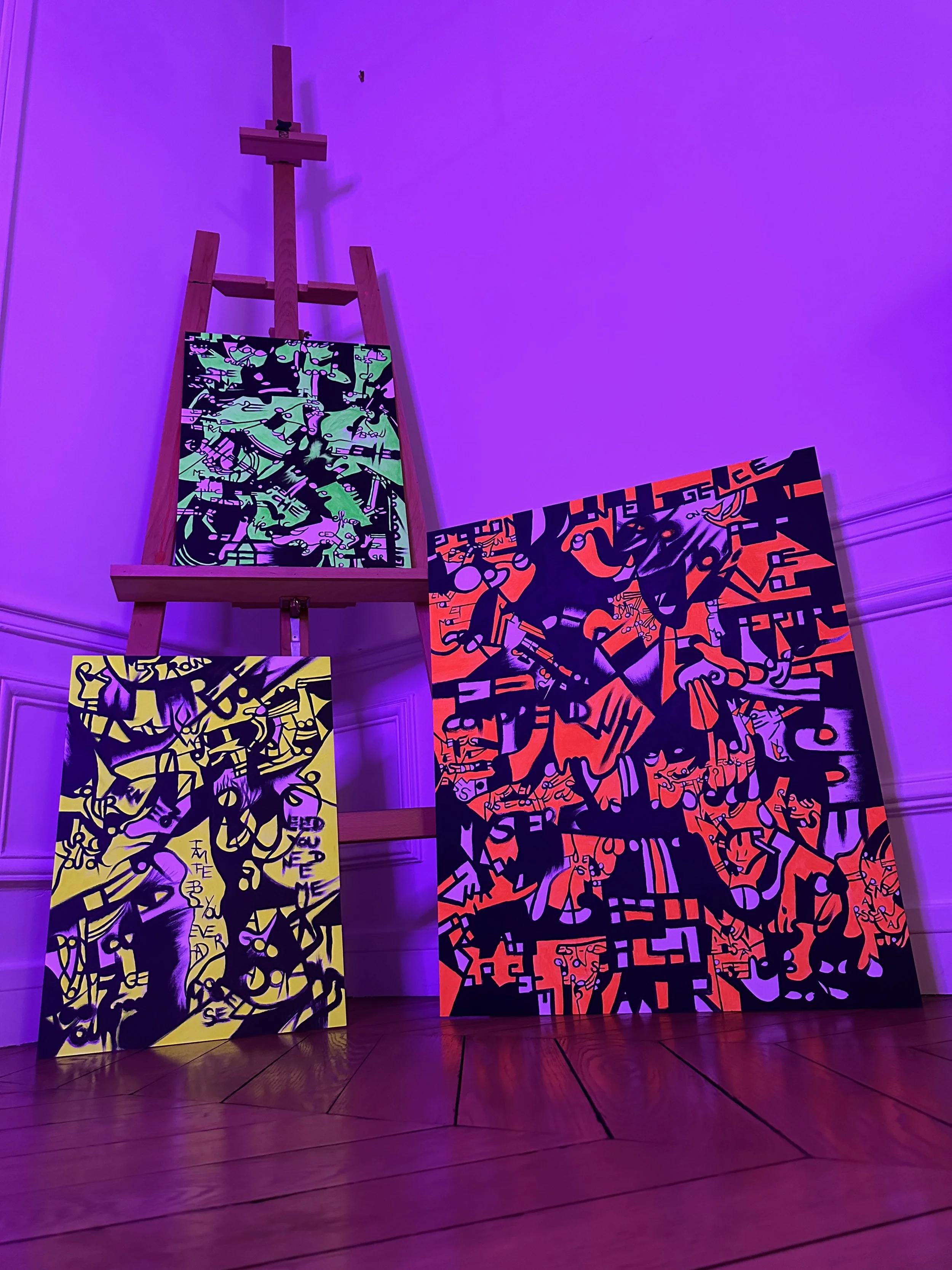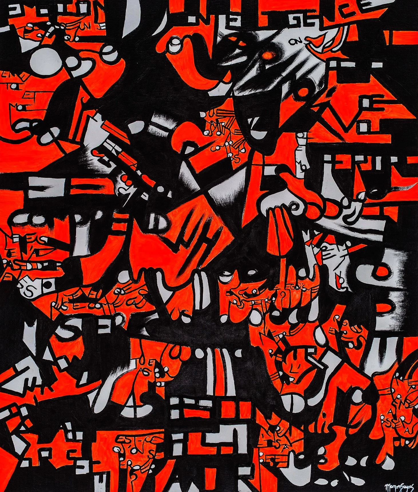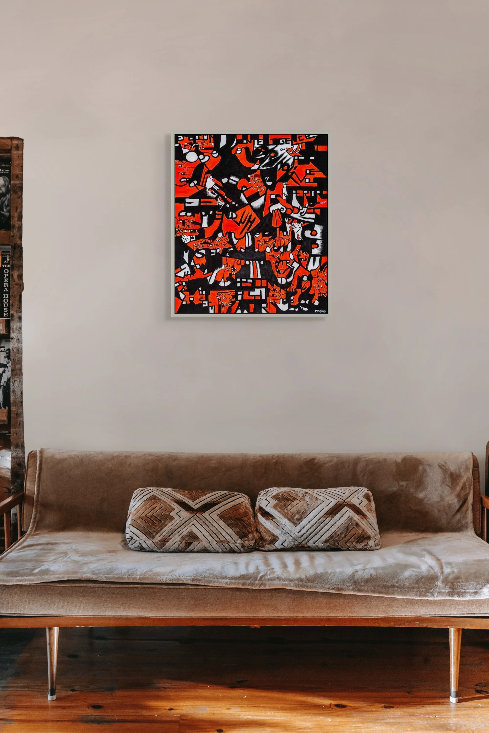 Un orange fluorescent s’entrechoque avec le noir, capturant la tension entre attirance et peur. Des lignes nerveuses ondulent à travers la composition, faisant écho à un dialogue inavoué. Une forme partiellement voilée suggère quelque chose de retenu, tandis que des regards attentifs s’attardent, brouillant la frontière entre intimité et distance. Le silence devient un langage à part entière, maintenant tout dans un équilibre fragile.